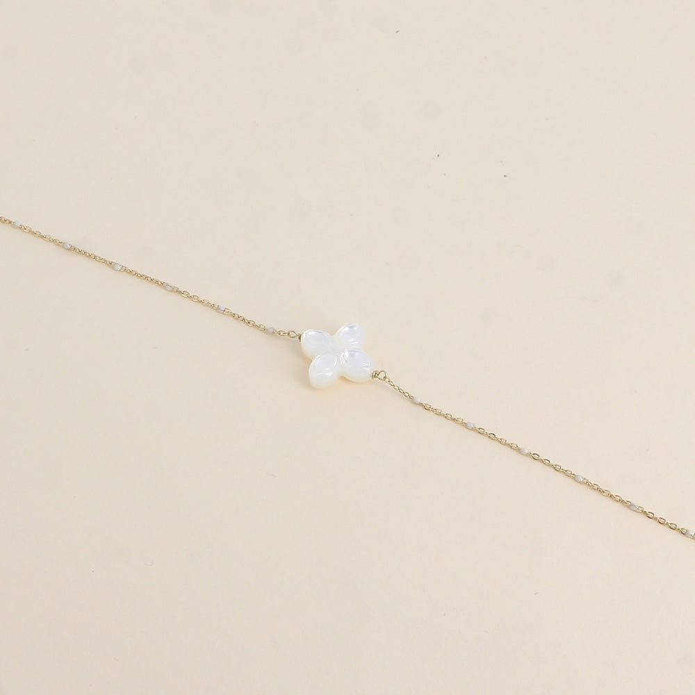 Bracelet sur chaîne en acier inoxydable composé d'une chaîne aux touches émaillées et d'un pendentif en forme de trèfle nacré.