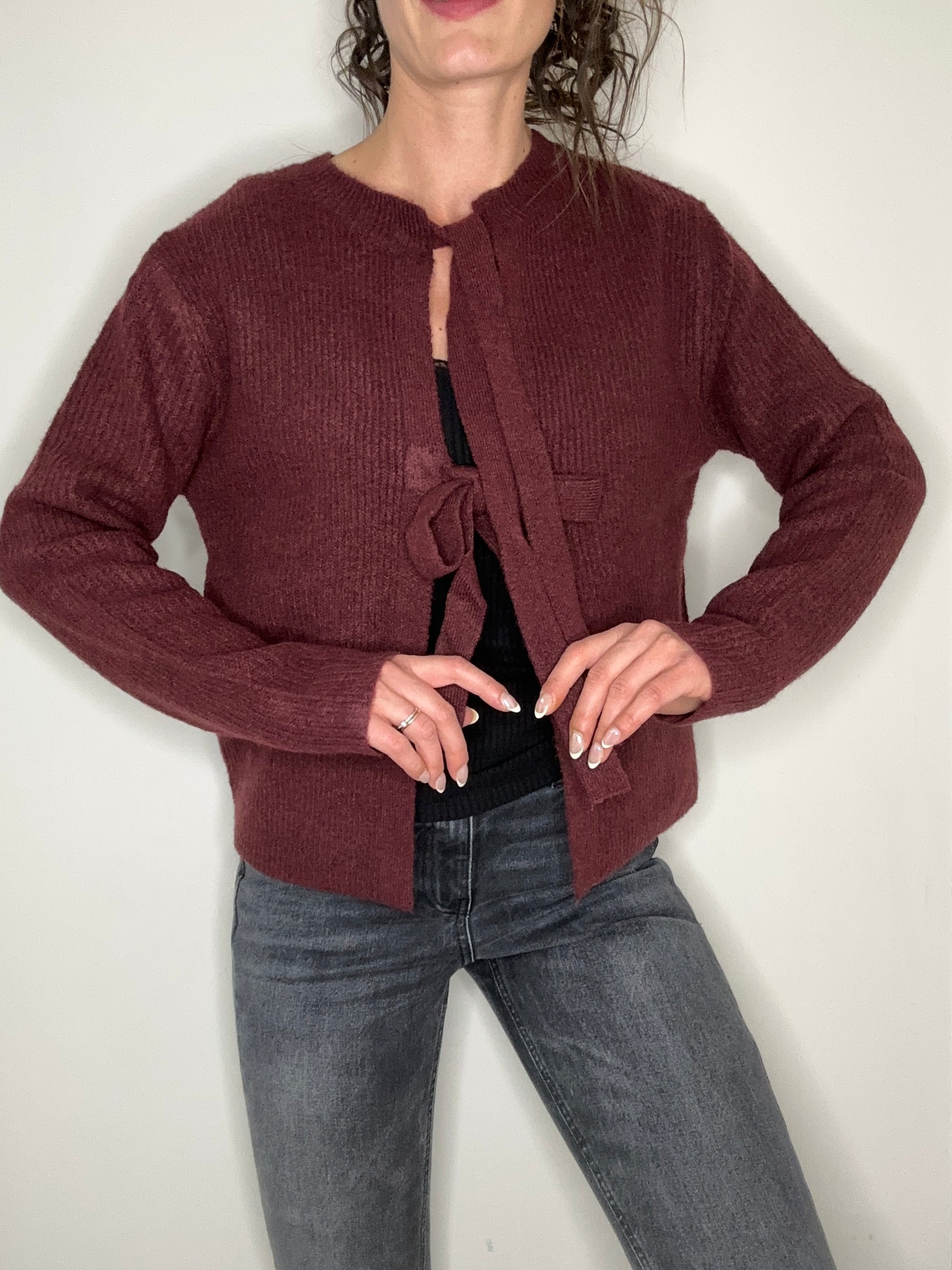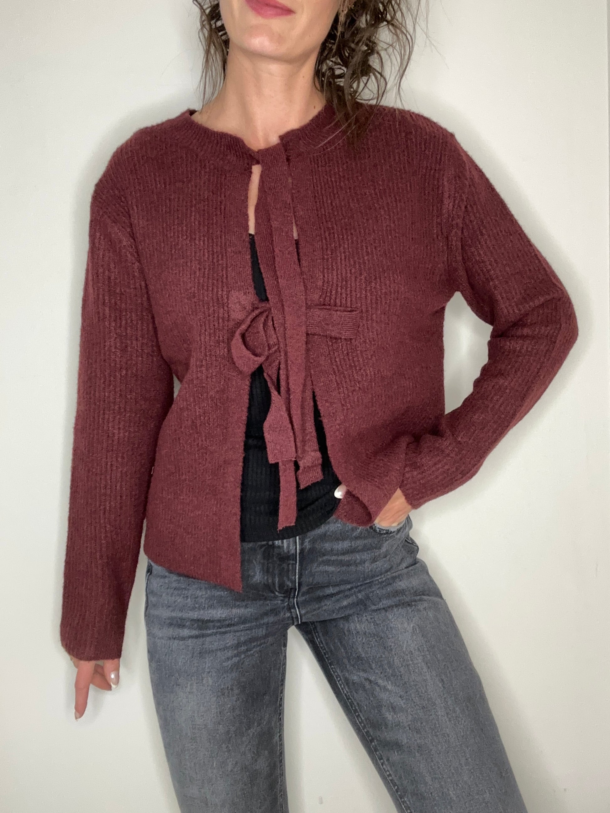 Ultra tendance, ce gilet tout doux au style féminin avec ses liens à nouer.