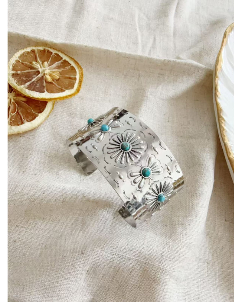 La manchette argentée avec ses pierres turquoise pour un style bohème.