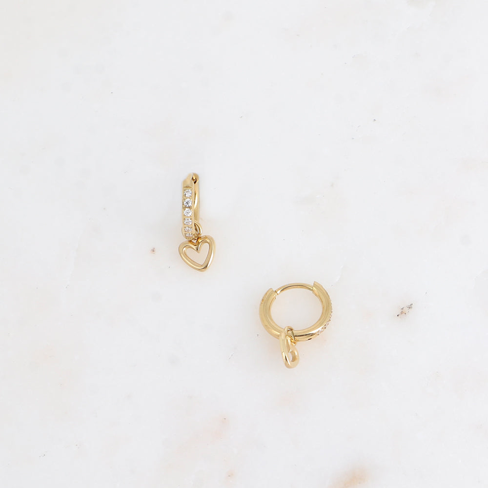 Boucles d'oreilles type mini-créoles avec fermoir à charnière en acier inoxydable composées d'un anneau serti d'oxydes de zirconium et d'un pendentif en forme de coeur ajouré.