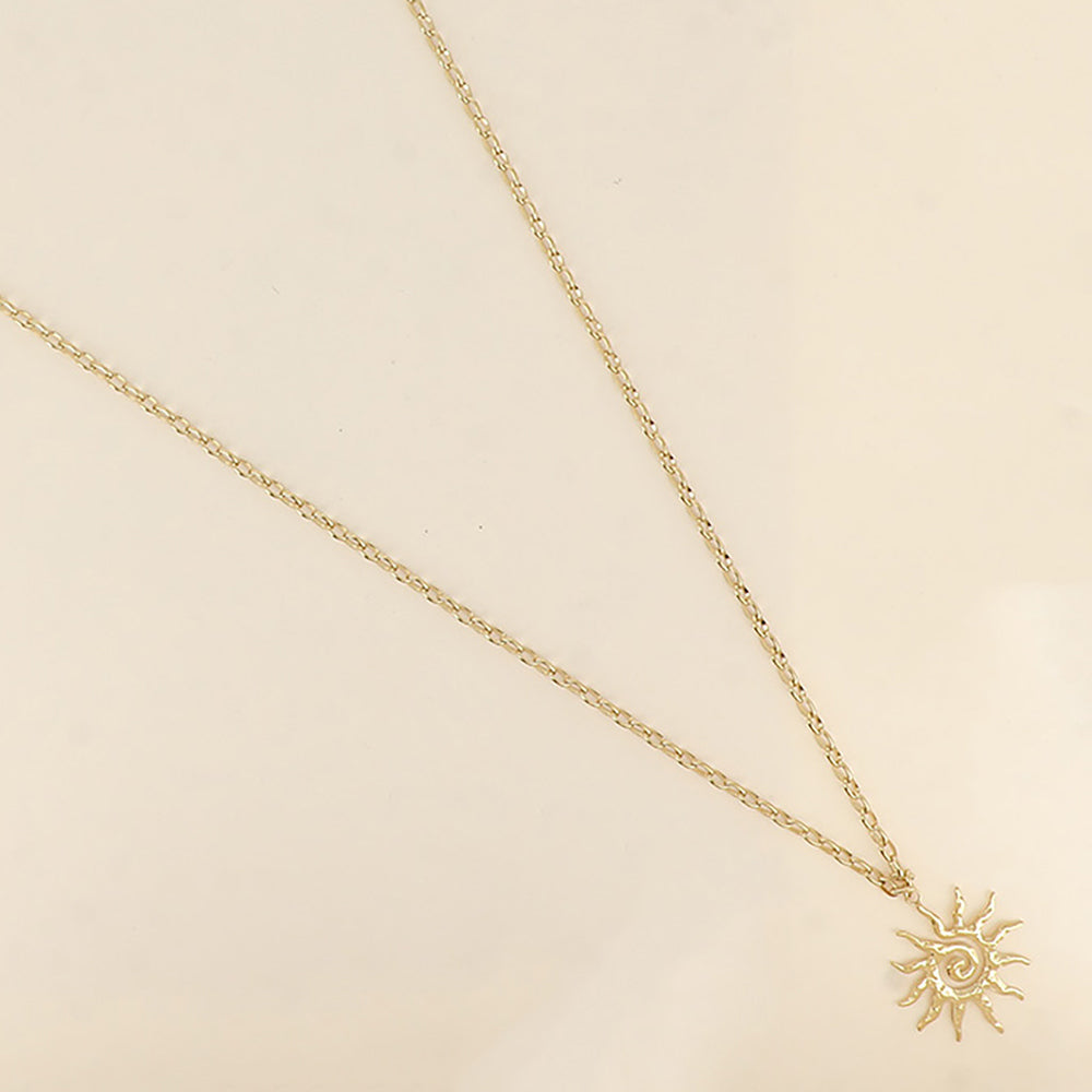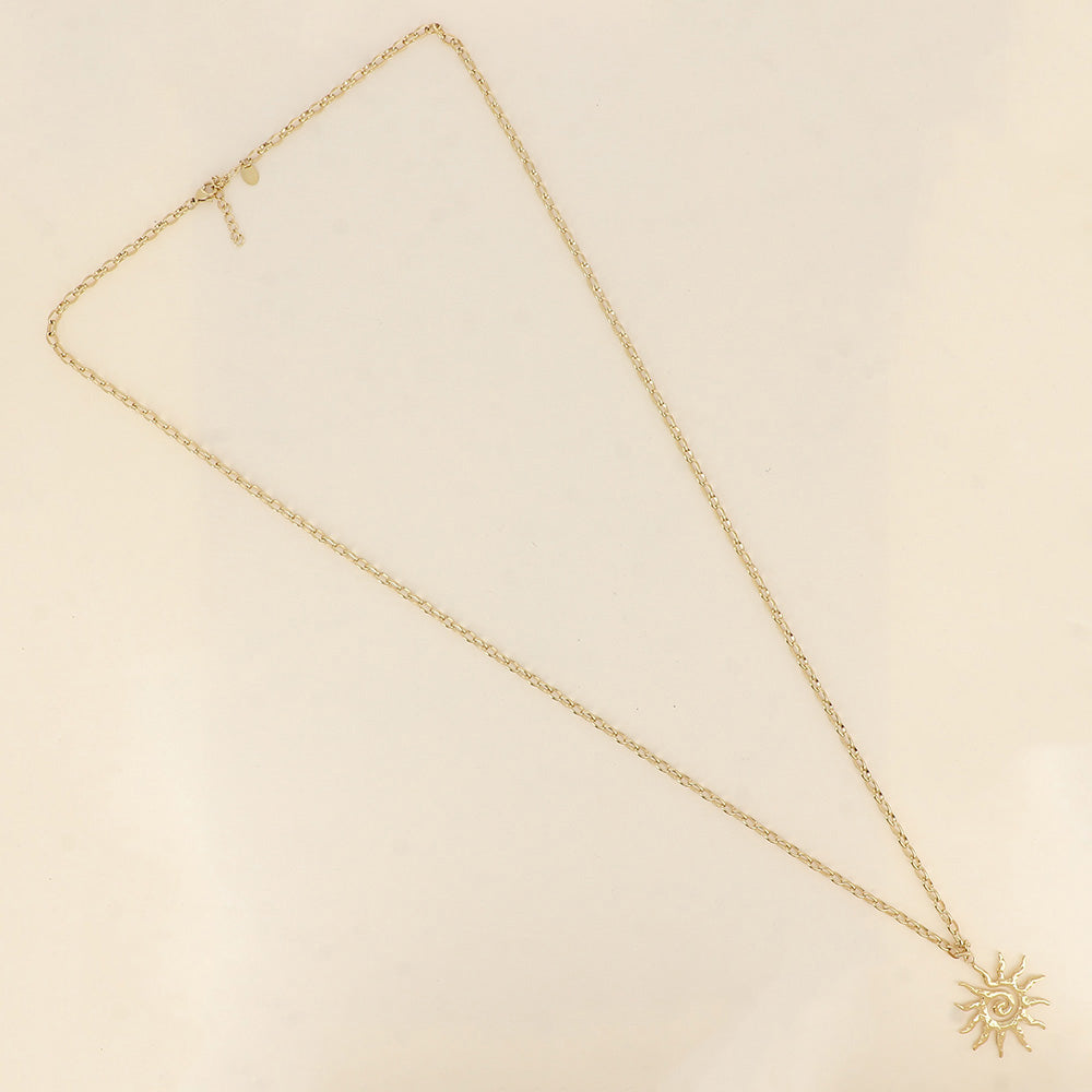 Sautoir sur chaîne en acier inoxydable composé d'un pendentif soleil.