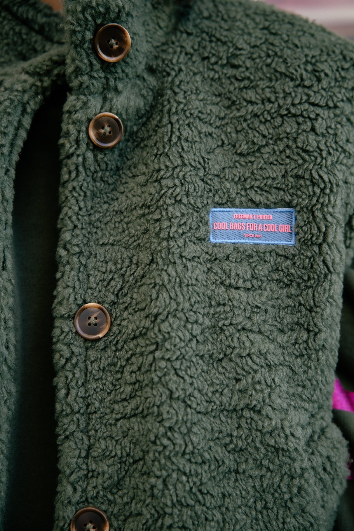 La veste en sherpa Kaki ultra mode et sa doublure léopard. Une pièce original pour des looks modernes.